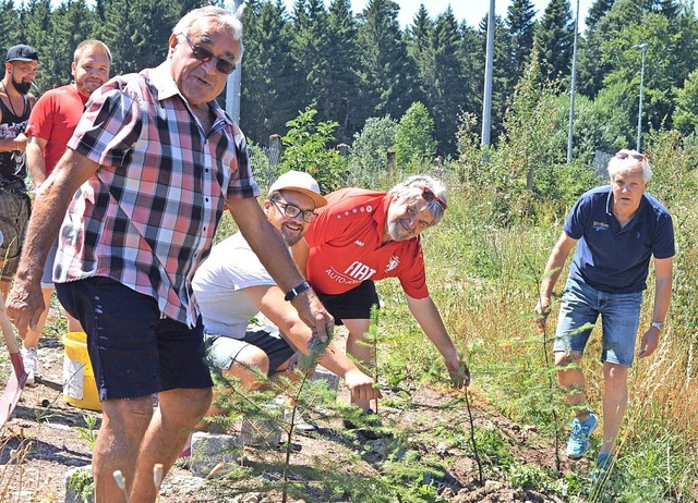 Rolf Maier, Nico Schwenninger (für Siggi Schwenninger), Franz Kirchsteiger und Karl Heinz Strauß (von links) pflanzten die ersten TuS-Jubiläumsbäume. Foto: Norbert Kriegl