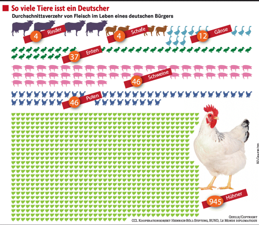 BERLIN (dpa). Laut einem am Donnerstag in Berlin vorgestellten Fleischatlas verzehrt jeder Deutsche im Laufe seines Lebens 945 Hühner, 46 Schweine, 46 Puten, 37 Enten, zwölf Gänse sowie jeweils vier Rinder und vier Schafe. Der Bund für Umwelt und Naturschutz (BUND) forderte eine Abkehr von der massenhaften Fleischproduktion.